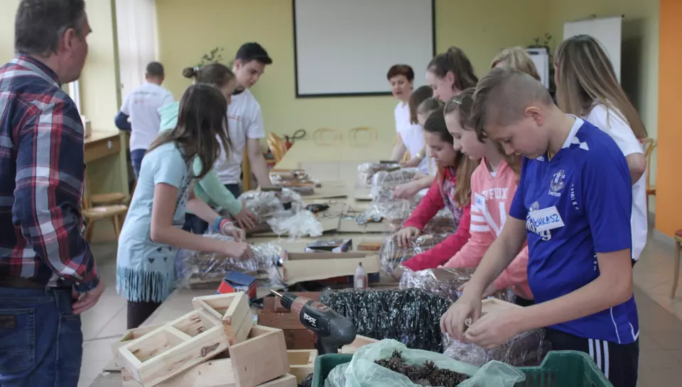 Praca wymagała wielu umiejętności, jak chociażby wkręcanie śrub, wiercenie otworów, przycinanie bambusowych patyczków. Nasi mali goście z radością i bardzo sprawnie, pod okiem wolontariuszy radzili sobie z tymi czynnościami. Przygotowane podczas spotkania budki i hotele zawisną na drzewach rosnących wokół elektrociepłowni EC4 w Łodzi, aby ptaki zamieszkujące ten teren, mogły zakładać w nich swoje gniazda.