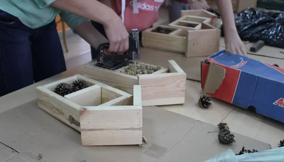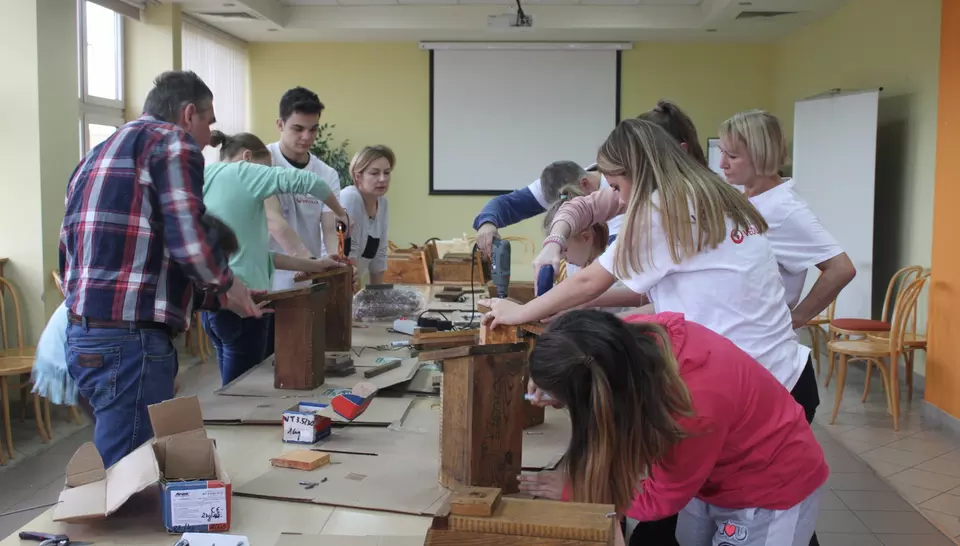 Tym razem wspólnie wykonaliśmy 20 budek lęgowych dla ptaków i 10 hoteli dla owadów. Spotkanie rozpoczęło się od krótkiego wykładu,