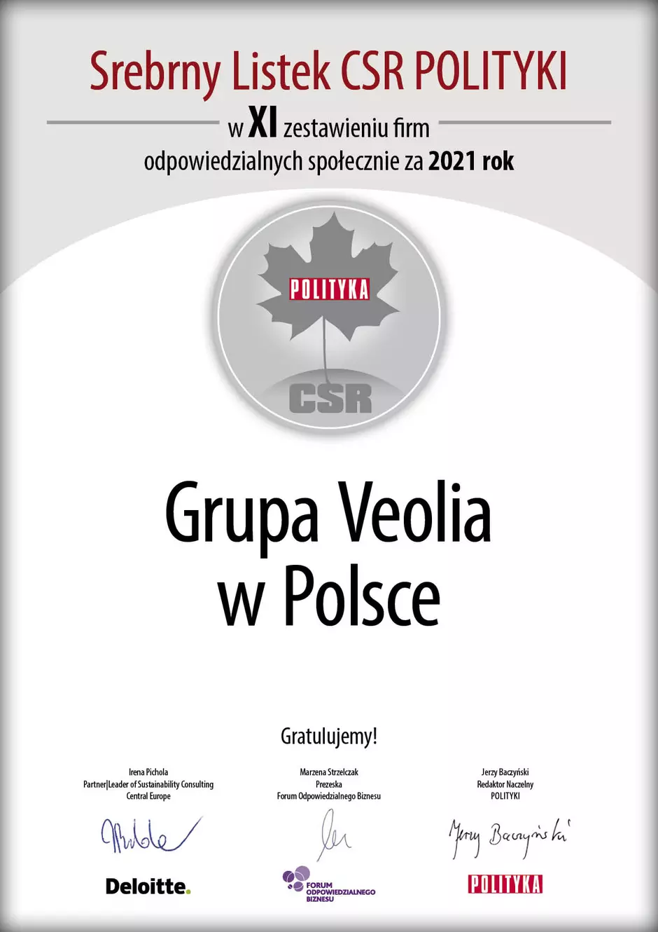Listki CSR to wyjątkowe zestawienie polskich liderów zrównoważonego rozwoju i ESG (ang.environment, social and corporate governance - środowisko naturalne, społeczeństwo i ład korporacyjny), wyróżnienie przyznawane od 11 lat przez Tygodnik Polityka, firmę doradczą Deloitte i Forum Odpowiedzialnego Biznesu. Grupa Veolia w Polsce otrzymała Srebrny Listek CSR za działania realizowane w 2021 roku.